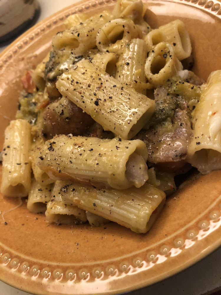 While the tomatoes were roasting down, I also roasted a few sausages. Rigatoni for dinner tonight was delicious.