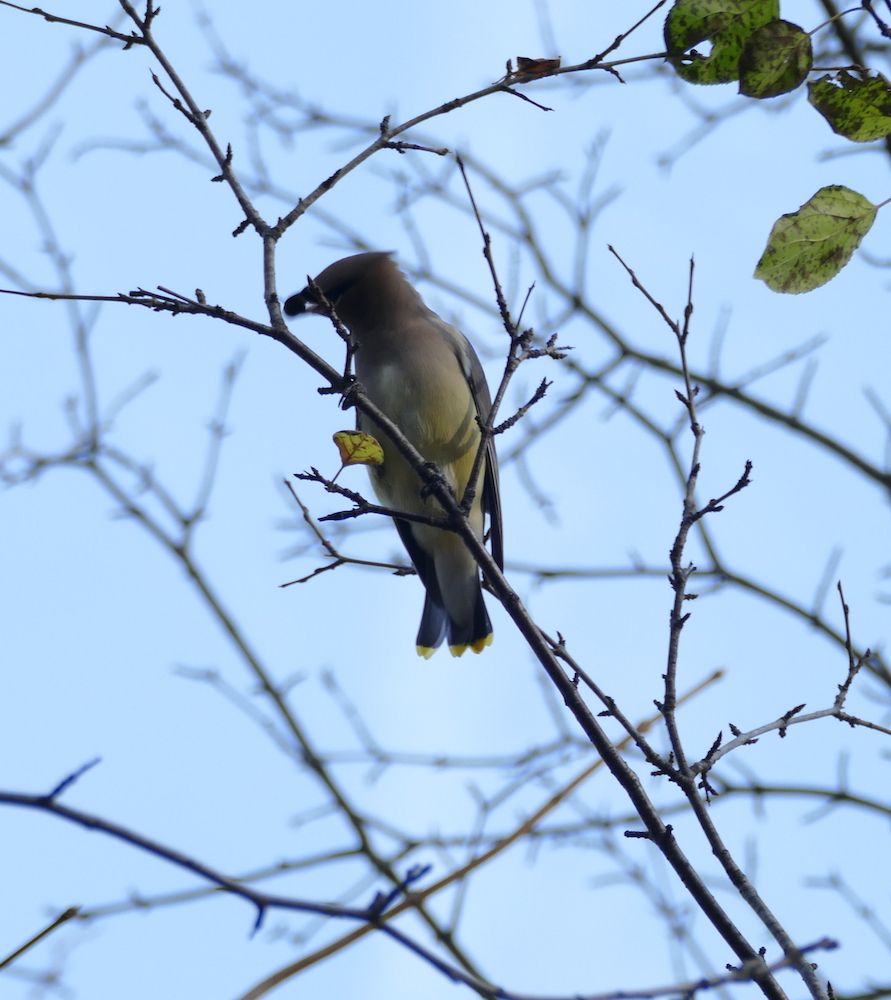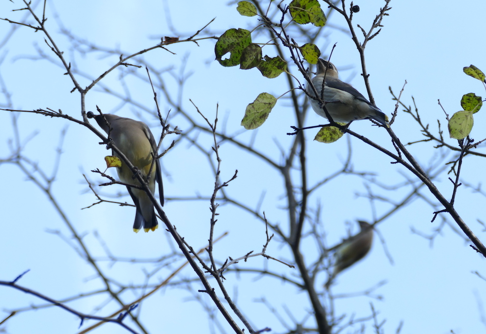 Around here the waxwings travel around in groups of 5-20. This time of year they’re enjoying the last of the berries and other fruit on the shrubs and trees. They’re one of my fave birds.