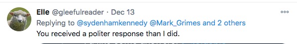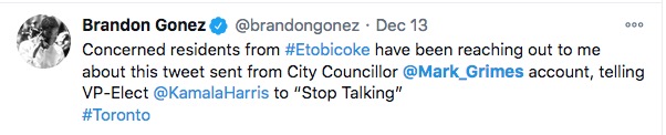 The article notes that late last Saturday night, Mark Grimes sent out a tweet to US VP Elect Kamala Harris to “Stop talking!!” What’s up with that? He followed that one up with another, telling someone to “go to bed and don’t forget to brush your Sheep.” These came from the @Mark_Grimes twitter feed. I’d like to understand where the Councillor was coming from, but he didn’t respond to requests from Toronto.com/Etobicoke Guardian for an interview. Refer to their article by David Nickle.