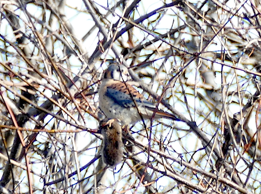 It turned out to be North America’s smallest falcon, an American Kestrel (Falco sparverius, sometimes called a sparrow hawk), and it looks like he’s got some lunch.