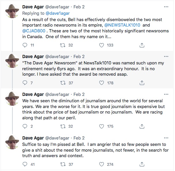 I’m sad that good people have lost their jobs. I’m also sad that journalism in this city has been dealt another blow. Let me finish this post by quoting some Tweets by former Newstalk 1010 newsman Dave Agar….