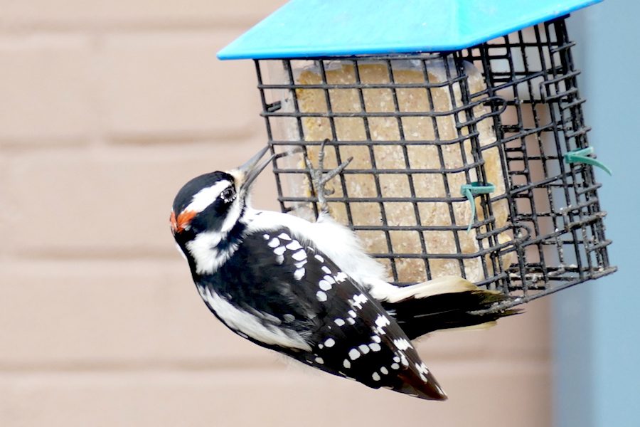 This tree has been festooned with birdhouses and feeders. Here we saw another woodpecker, this time a downy.