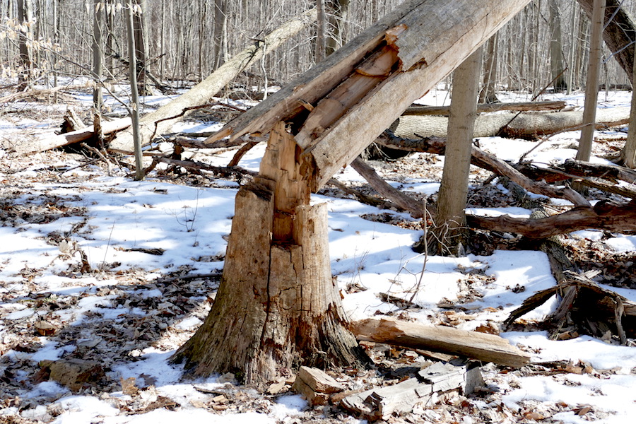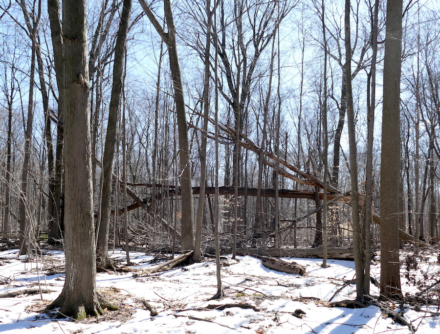 Unfortunately, significant parts of the trails are iced over, so most of our walk was through the woods, where we navigated amongst many downed trees.