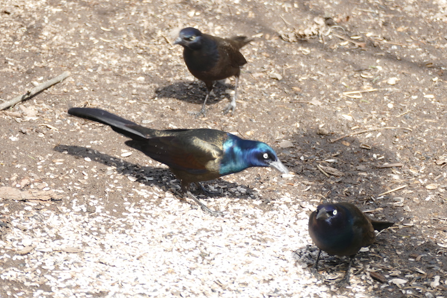 On a dull day, they look like big all-black birds, but when the sun is out, their iridescent blue heads and bronze backs are gorgeous.