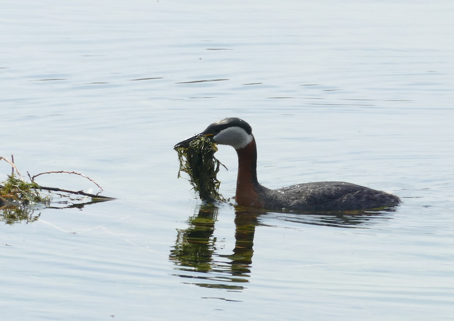 In between fits of laughter, the red-necked grebes are busy with construction activities. I’m not sure who is responsible for it, but for years now, nesting platforms have been provided for the grebes. Nesting is often successful, though I have seen cormorants bully the grebes away from the platforms.