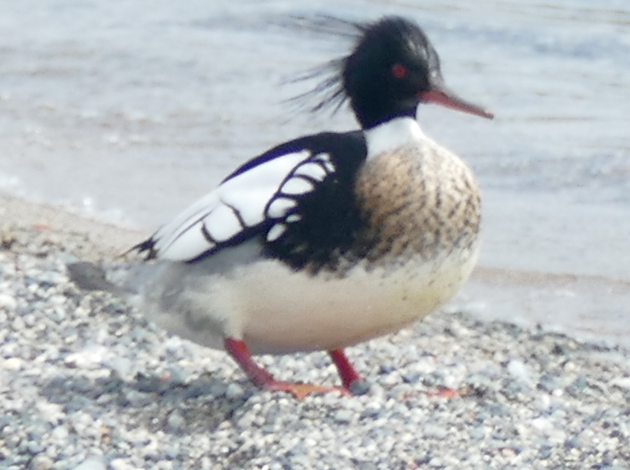 There were lots of mergansers around today. I don’t usually see the red-breasted mergansers on shore, but caught this one returning to the water.