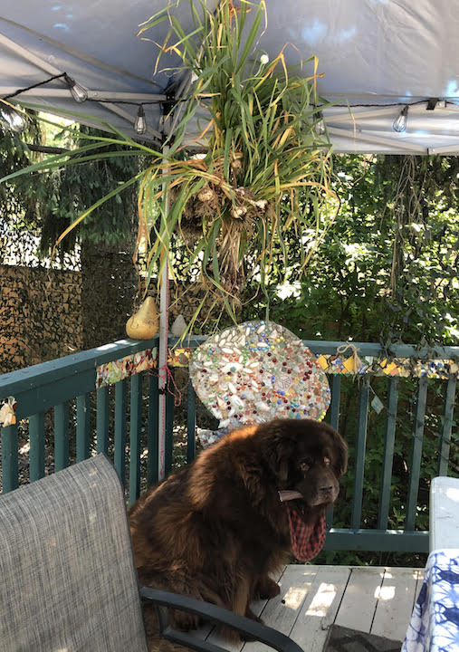 We harvested all our garlic today. There are 53 bulbs in all, plenty enough to scare away any werewolves, vampires or other nasty supernatural beings on Twenty Seventh Street. I’ve got it all tied in bunches and hanging from the “easy-up” on our deck, away from direct sun, where it will stay to cure for a couple weeks. After that, I’ll clean off all the clingy dirt and remove the roots, then braid it (badly) and hang it in the kitchen.