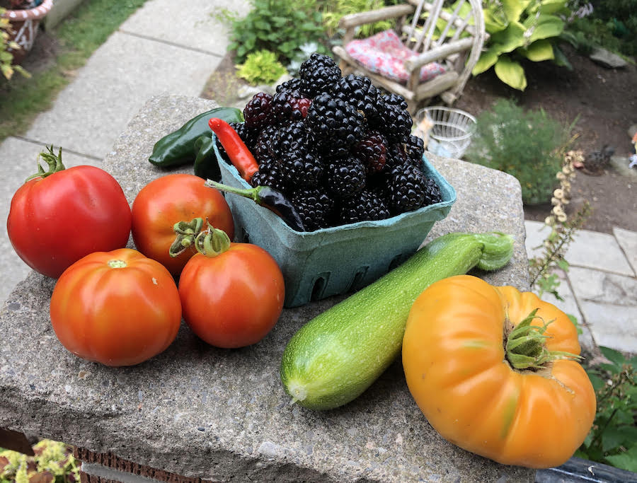 Our garden has been so generous this year. Unlike in much of the country, we’ve had plenty of regular rainfall in Southern Ontario this season and I think that has helped a lot. Each morning I go out and pick what is ripe. At this time tomatoes have been ripening faster than we can eat them, and with 1 or 2 zucchini each day, so are they. One of our 2 zucchini plants has died off but the other one is in great shape and producing well. It seems the zucchinis do better growing in the ground than in containers. Good to know for next year.