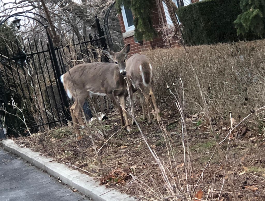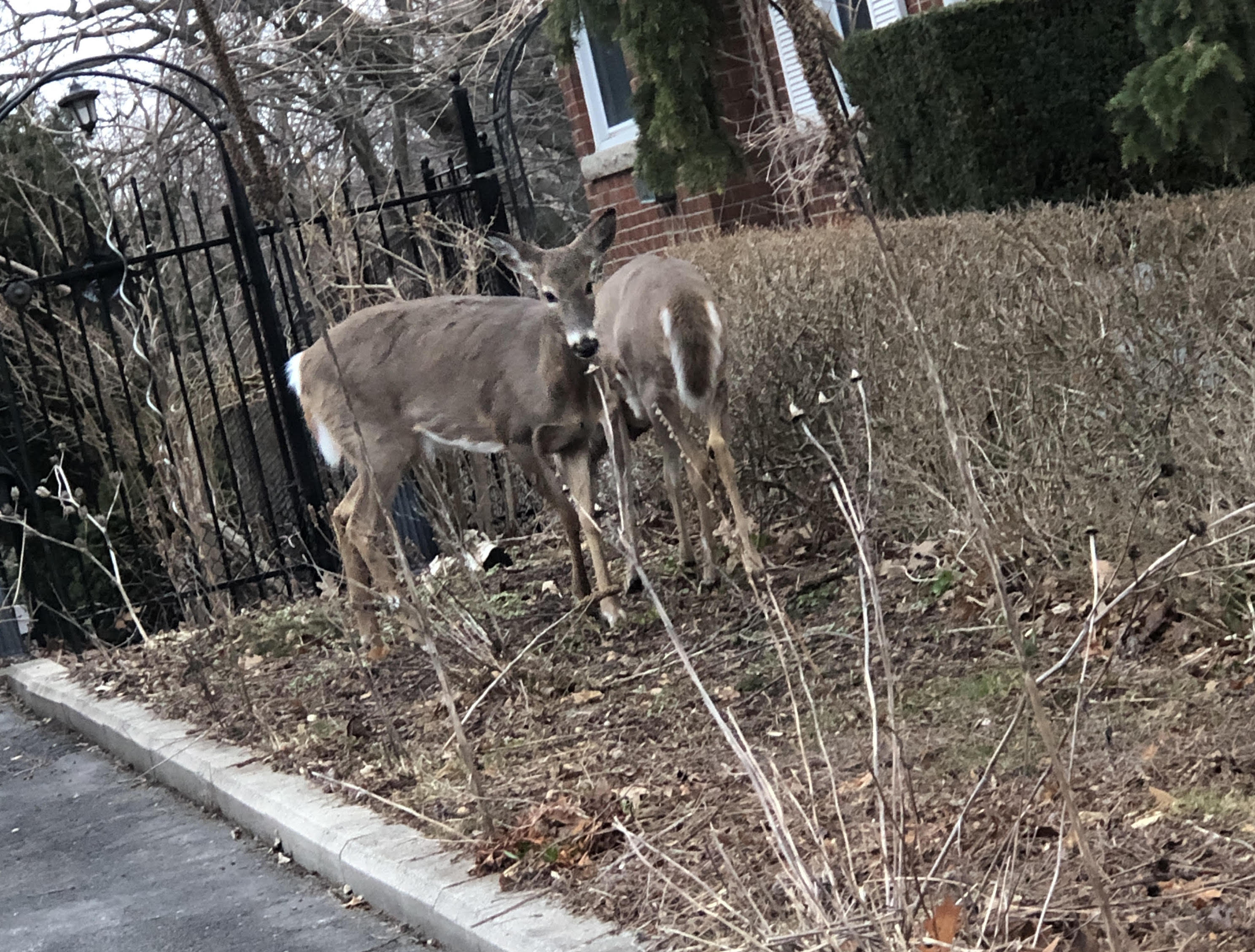 On the way down from Kingston Rd. to the meet-up spot for the nature walk this morning, I saw unusual movement in my peripheral vision. It turned out to be 3 deer in somebody’s front yard. By the time I stopped and opened up the camera on my phone, one of them had already taken off. What a pleasant surprise.