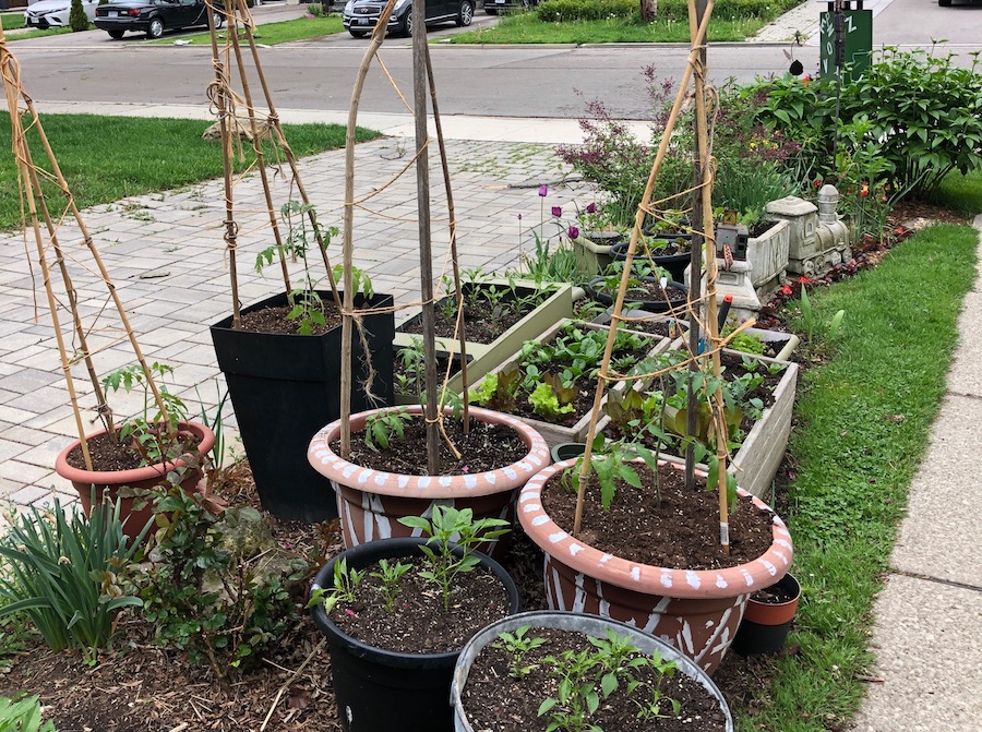 Our tomato plants were generously provided by our fiend Jennifer Arnott, from The Fabulous Garden. I’ve got several varieties including Sungold, Old German, Boxcar Willie and more. I’ve also got several varieties of chilies this year, as well as lettuce (lots from seed but also some from starter plants), bok choi, spinach (from seed, planted early directly outdoors), chard, kale, herbs, and this year I have 3 cantaloupe plants. I’ve never grown cantaloupe before. Any tips on getting plenty of melons?