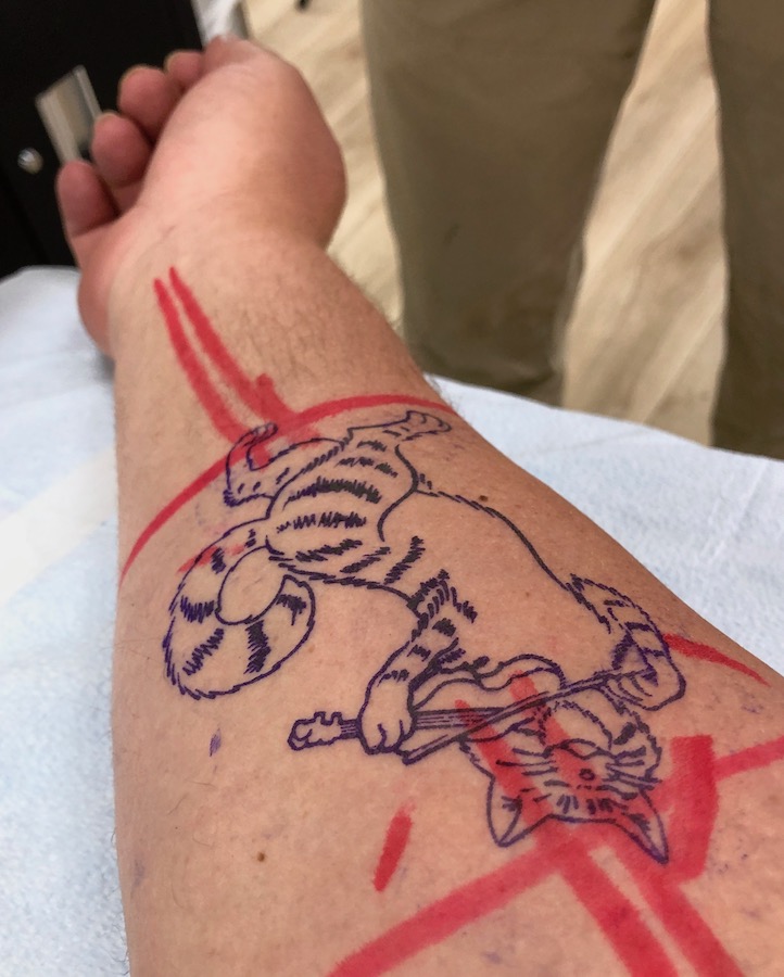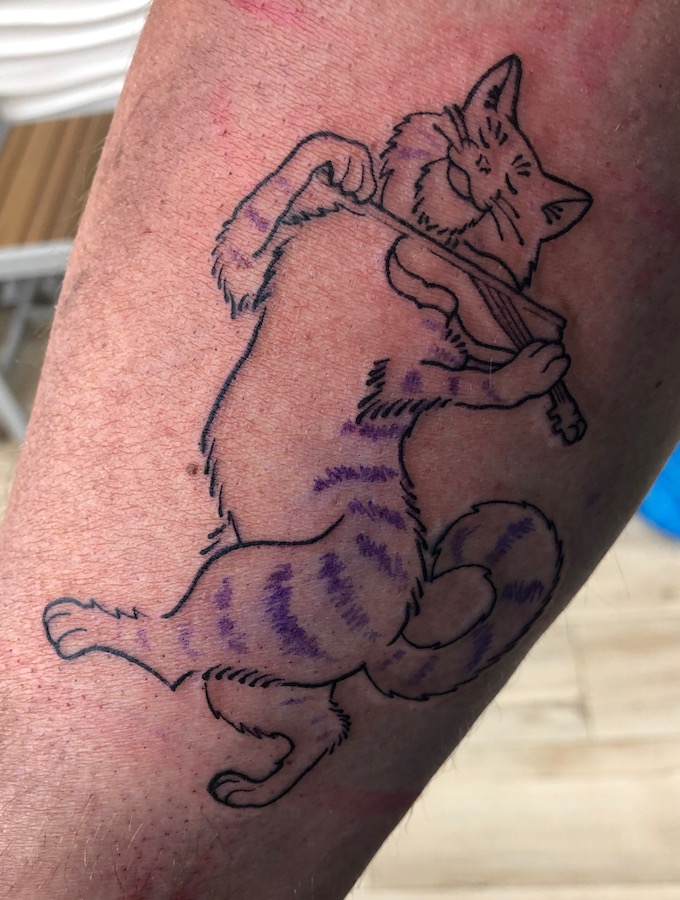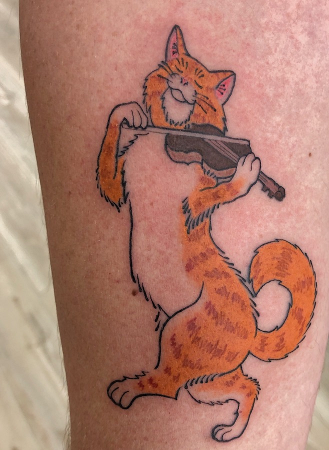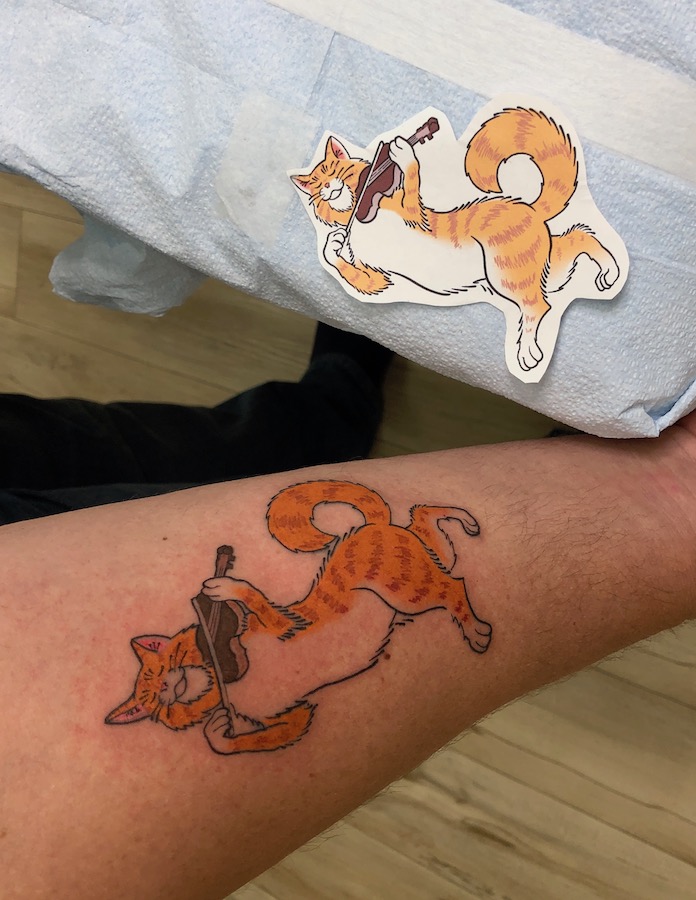 For a long time, I didn’t think I would get a tattoo because I didn’t think I could settle on an image for the long term. I guess I changed my way of thinking, stopped taking myself so seriously. Someone on social media asked me for more about why I chose this image, but I don’t have a lot to say about that, beyond it is playful and light-hearted and it pleases me.