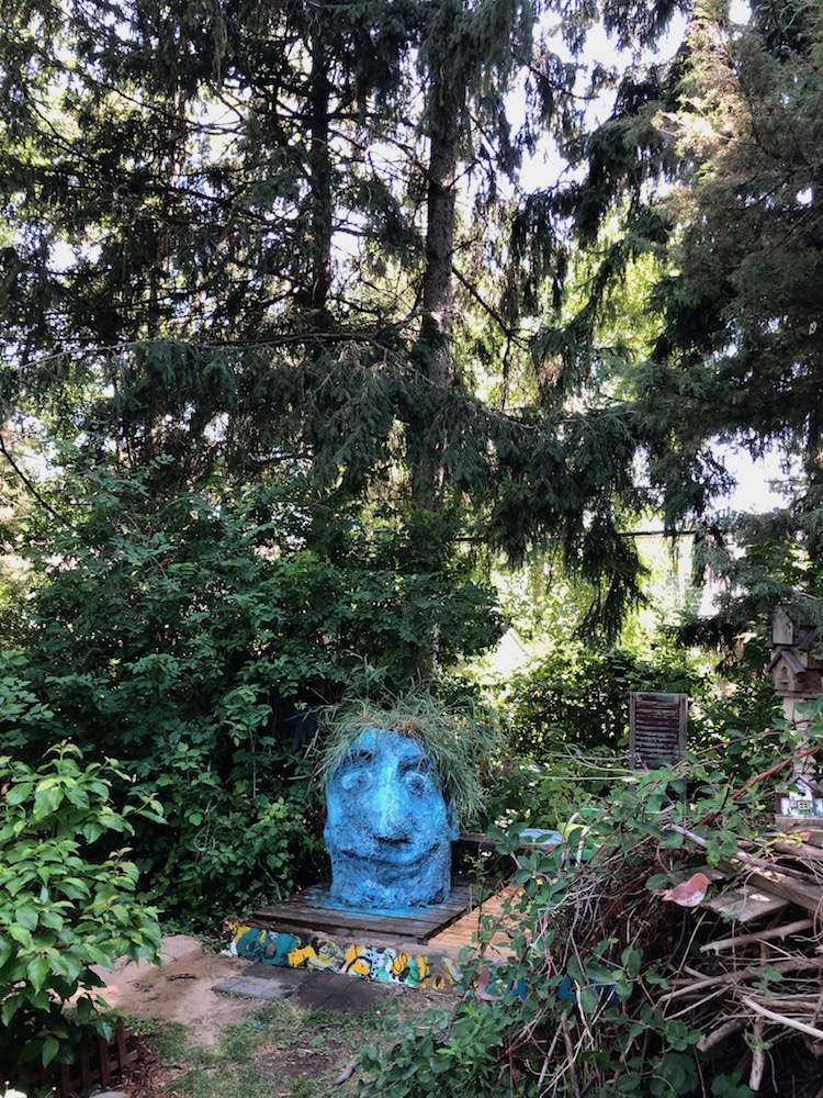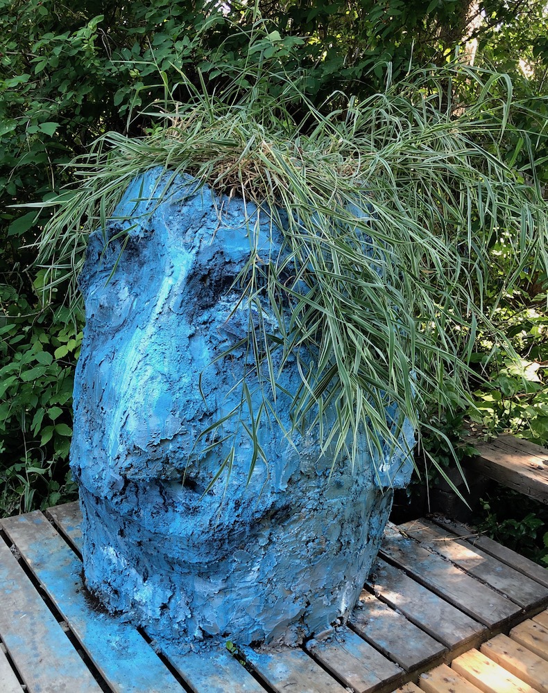 Last week, when Stagg was in town from Chicago, we started this mad garden project. It began with an armature built around the stand for a coat rack, with wood and strapping and hardware cloth. On that we built up cement, and then finally, acrylic paint.