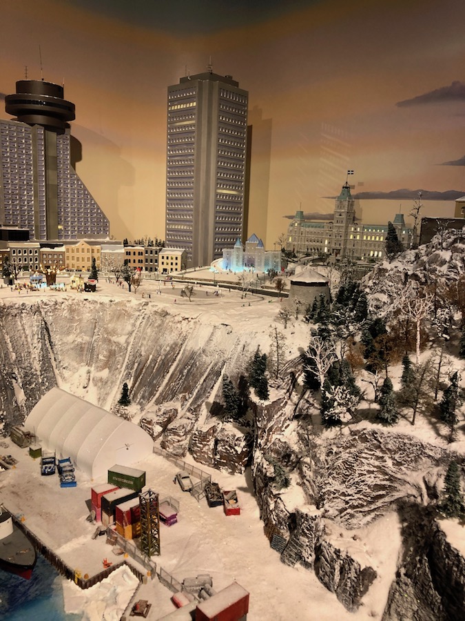 Here are a few pics I snapped during my visit. Little Canada is loads of fun and full of crazy amounts of detail. Many of the vehicles as well as the trains are in motion. I watched the skydome open and a ballgame start, with video on a jumbo-tron. I stayed in each area through a night/day cycle. Lights come on at night and the activity changes. At the Chateau Laurier, you can see what’s going on in each of the rooms. At the border, some guy’s car has over-heated. As well, there are several moose hidden within the layouts like a scavenger hunt.