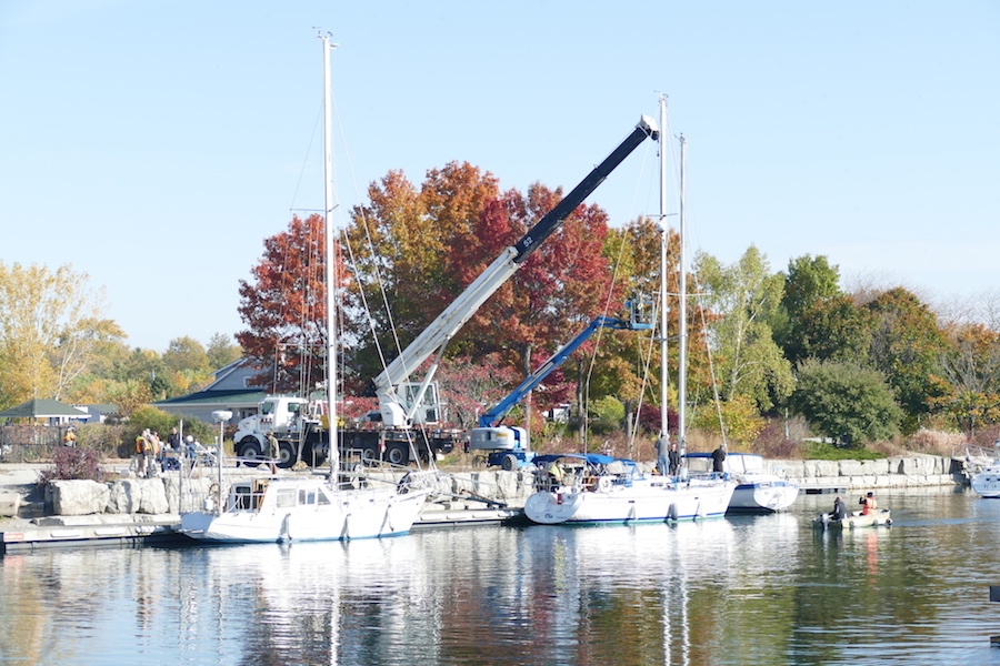 Today the footbridge at the west end of the park was closed as the cranes are here, removing the sailboats from the water for winter.