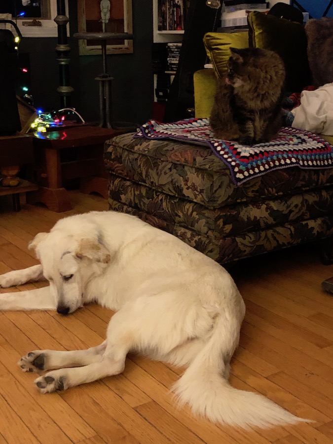Our cat Phyllis has already made friends and Jack and Gracie and Jacques went upstairs to check her out but they kept their distance. The dog seems fine with all the cats.