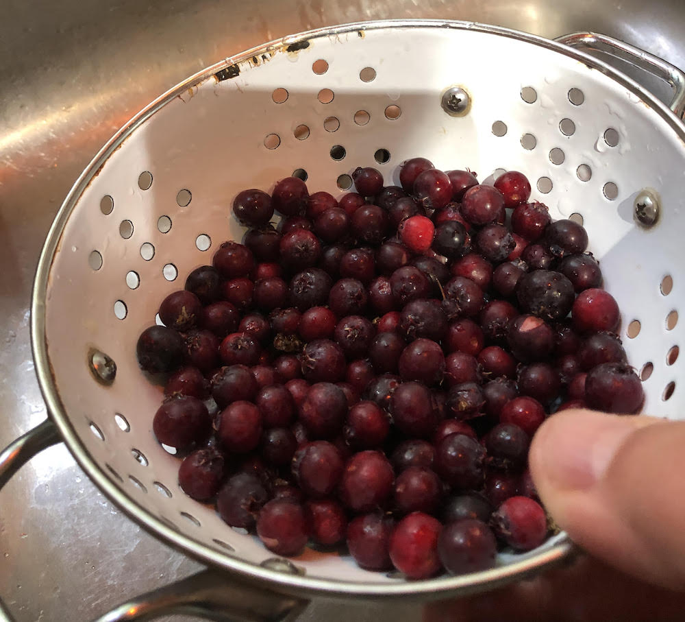 We have a Saskatoon, or Serviceberry bush out front, here on 27th Street. I’ve been watching the berries start to ripen over the past few days, and so have the birds. There were quite a few ripe ones today so I decided to do a first picking. A local robin agreed and was already enjoying berries for lunch when I went out with a container. I’ll pick every couple days over the next week. By that time, all the birds will know about them.
