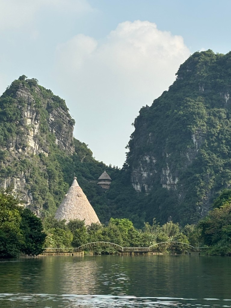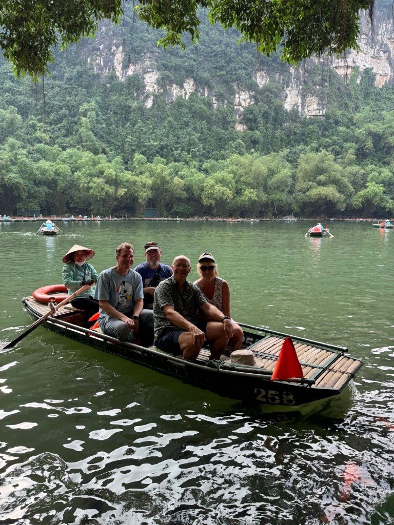 Stagg and I decided to get out of town for today so yesterday we signed up for a last minute 12 hour tour to Ninh Binh. This included visiting temples dedicated to royals during a time when the ancient capital was nestled among the limestone towering mountains. It also included a bike ride through part of the area, and a boat ride in which we were rowed through caves that created a passageway right through the mountain. Finally there was an opportunity to climb one of the mountains. Stagg did it, but I decided to protect my heel, which has some nagging tendonitis.