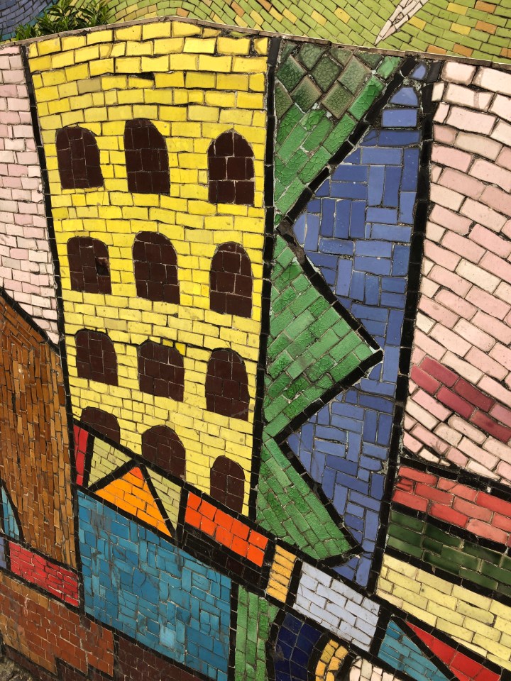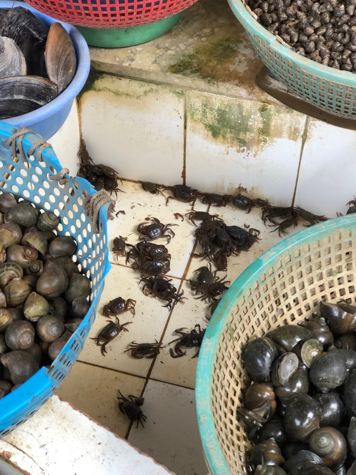 The soup lady gestured to plates she had under glass and said seafood. I nodded. She added a few ingredients to the bowl. I’m guessing but I’d say they were crab, freshwater mud crab paste, small dried shrimps she had reconstituted, and a pork ball. Then in went the veggies, the noodles and finally the broth.