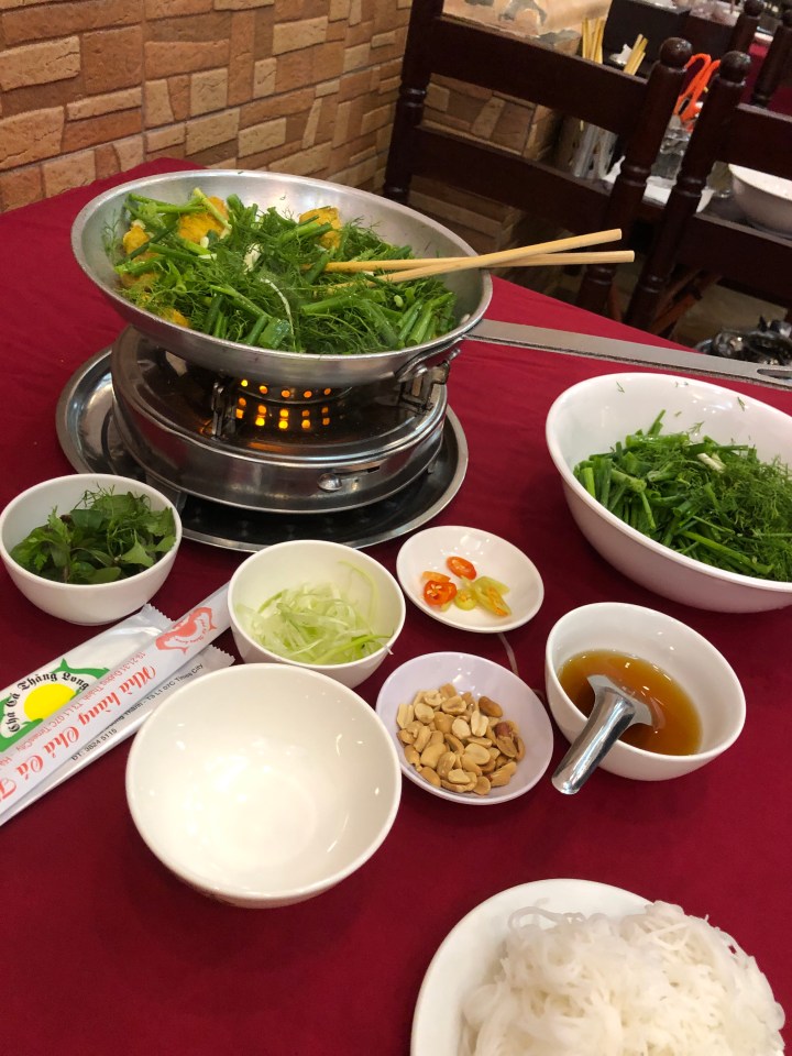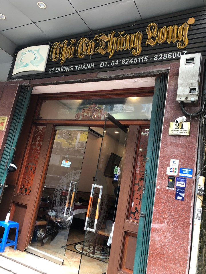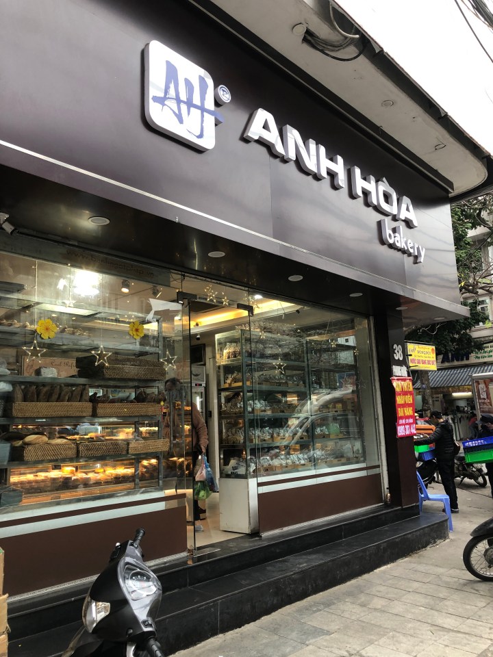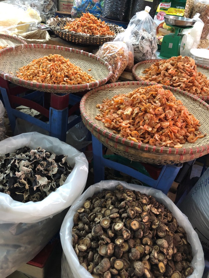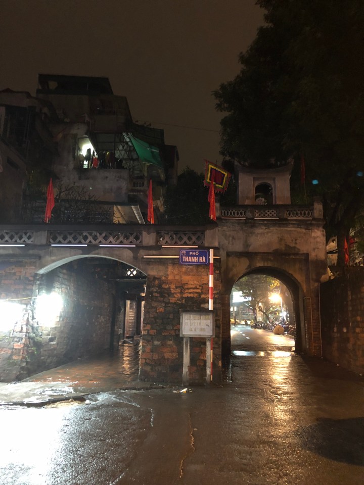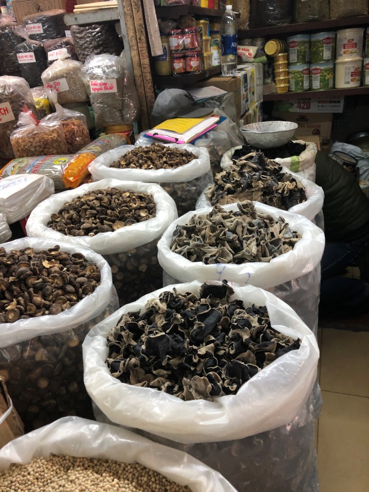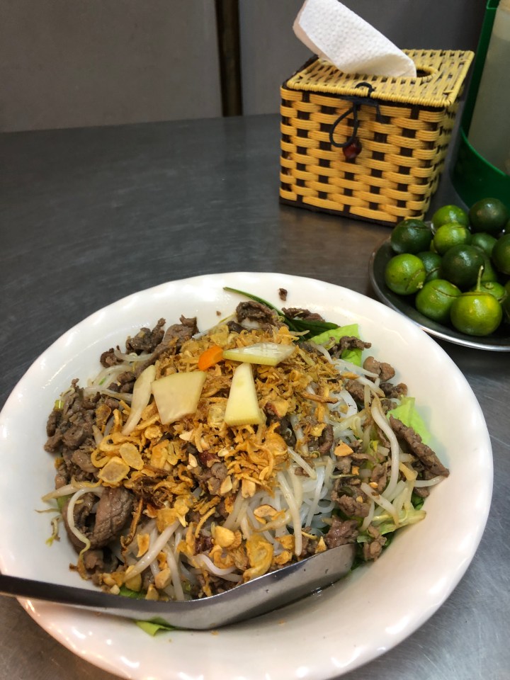 I tried asking the name of the soup, but I was unable to get across what I wanted to know. Back at my hotel, I showed the staff a picture of the soup and told them where I got it and they gave me the name. The particular thick noodles are called banh da. When I looked them up I found out they are a specialty of Hai Phong. The unusual colour is attained from a certain red fruit.