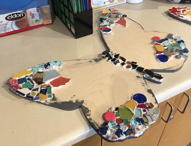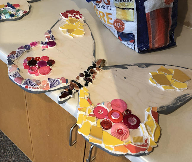 We pre-cut the butterfly shapes and also pre-cut a selection of broken crockery along with other items like big buttons.