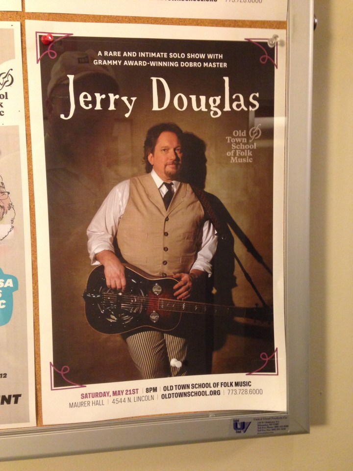 While in Chicago, I visited the Old Town School of Folk Music with my pal Candy, who works there. She toured me around, and then we popped across the street for dinner at Mash. That’s bbq brisket in the photo, with mac ‘n’ cheese, corn muffins and salad. It was a super-tasty dinner. Candy had to work, but got me a ticket to see dobro whiz Jerry Douglas do a solo show at the School. The concept of dobro as a solo instrument is unusual but when it comes to dobro, Mr. Douglas is the man, and he sure can play that thing.