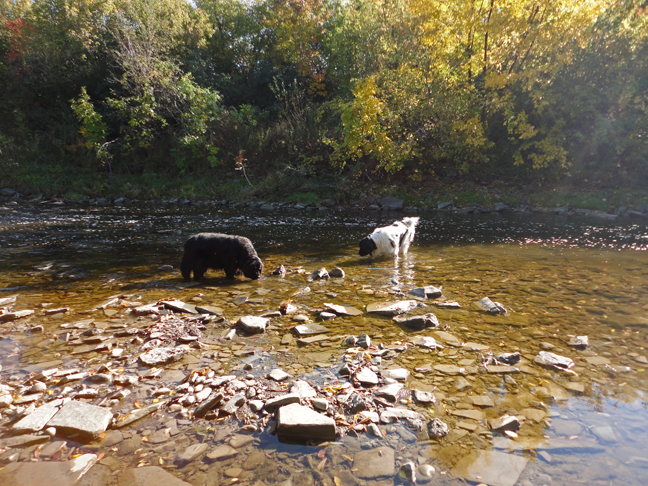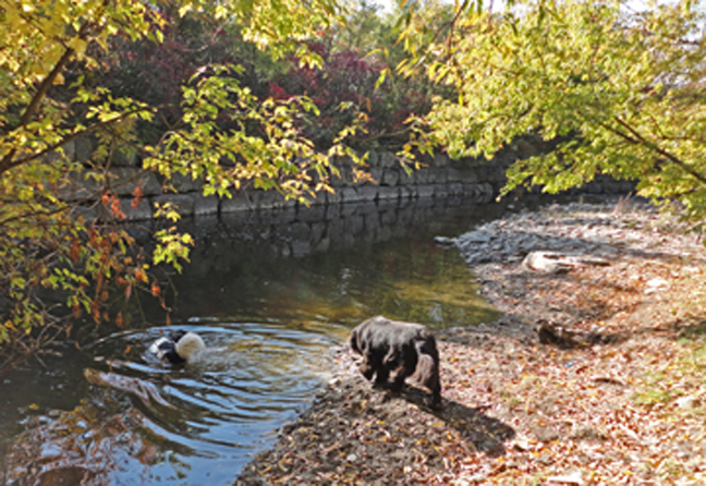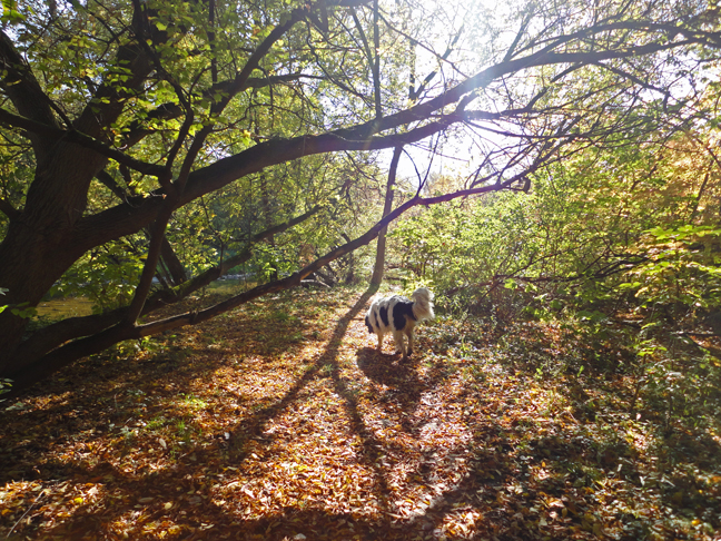 We were thinking of a day drawing and painting in the landscape today, but it was a littly chilly for that, so we settled on taking the dogs to the South Etobicoke Creek dog park. This off-leash area was closed for quite a long time and reopened in late summer. I understand the reason for the closure was so the city could run some storm sewers down through there. This is the first time we’ve been back since it reopened.