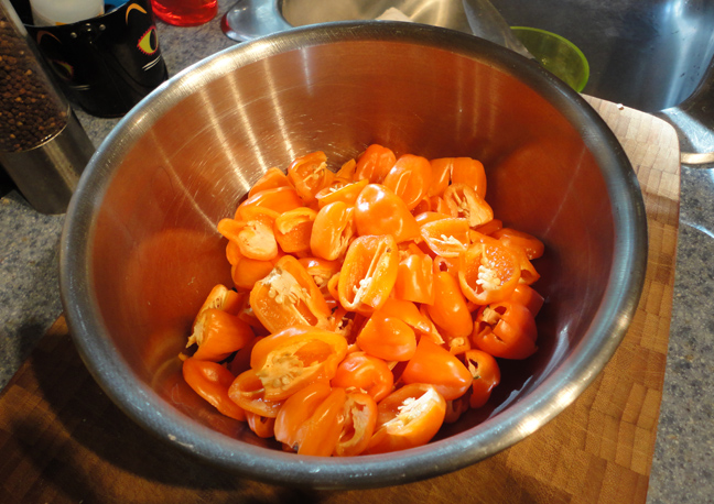 Somewhere along the way, Tuffy P and I developed a tolerance and love of hot foods. At a certain point we found we could not buy ground chiles that were hot enough to give us that spicy jolt we were looking for, so we began taking a do-it-yourself approach. When we get close to running out, I buy the nicest looking scotch bonnets I can find, slice them in half, and dry them. To do this, I use the handy dehydrator I have on hand for mushrooms. Once they’re totally dried, I grind them up in a coffee grinder. The first time I tried it, I used a food processor to grind them and that was a big mistake. A food processor doesn’t seal in the fumes the way a coffee grinder does, and I ended up with a coughing fit from these hot chiles. Yesterday I saw some beautiful looking all orange scotch bonnets in a local grocery, so I bought a bag. The cashier said to me, “How on earth are you going to eat all these. You know how hot these things are?”