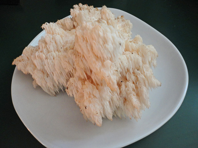 While out for a stroll in a small woods with Tuffy P this afternoon, we kept our eyes open for the possibility of a mushroom or two after all the rain we recently enjoyed. It was Tuffy who spotted the Bear’s Head Tooth. I think there were three of them in the same area, all growing from beech trees, not far from the ground. The one in the picture was nice and fresh, and we harvested it for the table.