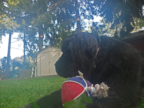 Ellie Mae rarely shows any interest in toys, unlike her pal Memphis, who nurtures them. The other day, though, she stole one of Memphis’ toys, and took it out to the back yard to rip it to shreds.