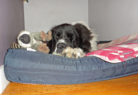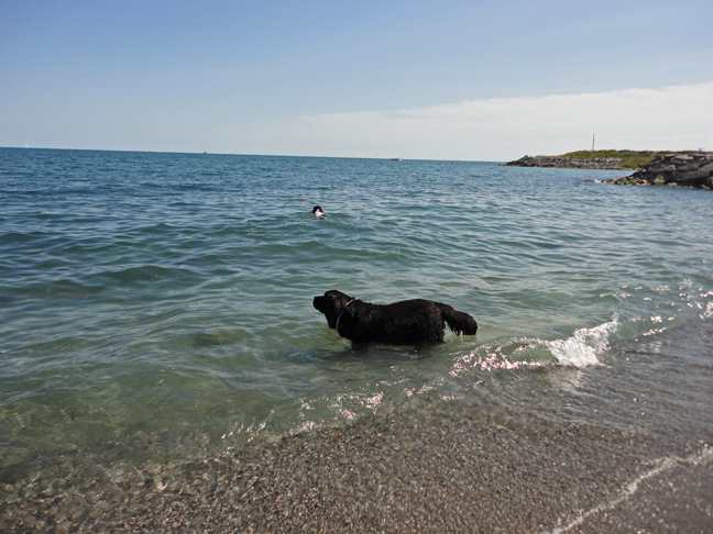 We took the dogs out for a walk this afternoon over to the dog-swimming beach. Now this isn’t a beach designated by the City for dogs to swim or anything like that. It’s just an excellent beach for dogs to swim, and lots of the local dogs and humans have figured that out. Today it was busy because several people had decided to watch the Air Show from the dog beach. Families were bringing picnic lunches down and I saw one family coming down to the beach with an extra-large pizza box. Fortunately for everyone involved, Memphis and Ellie Mae didn’t see the pizza box. Pizza is their very favourite food. In that way I suppose Newfoundland dogs are a lot like humans.