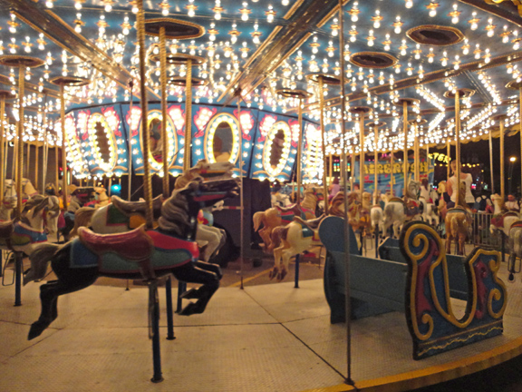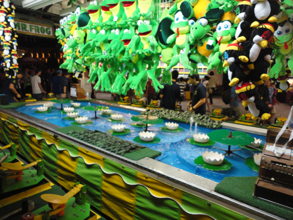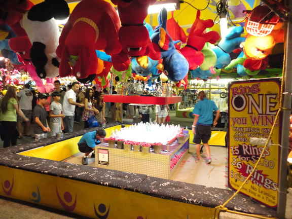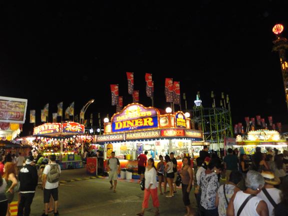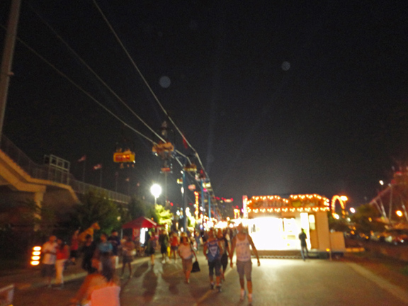 It seems that the midway hasn’t changed much over the years. Lots of lights and all those games where you can win stuffed animals. Even as a kid I could never win anything there. And then there’s the food, kiosks everywhere. Deep fried everything. Corn dogs. Candy floss. Sno Cones. BBQ Ribs. BBQ Corn. We didn’t go into the food building. When I was a kid, it was called the Pure Food Building. I remember back bacon sandwiches and 1 cent Pepsi. The whole midway, with the thrill rides all lit up looks great in a cheap and tired sort of way. It was fun to take a walk through.
