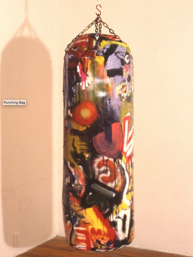 Faith 1992 Sheila Gregory & Eugene Knapik. 49″H x 14″ diameter + hanging chain. Acrylic & spray enamel on 80lb punching bag. From Knockout exhibition 2 person show (Gregory/Knapik @ Workscene Gallery, Toronto – inspired by Rubin Hurricane Carter.)