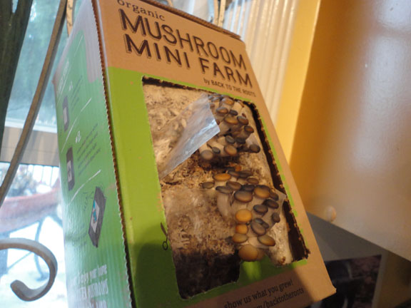 There I was in the produce section of the grocery store when I passed a bunch of interesting boxes – Mushroom Mini Farms. They even had two different brands. These are oyster mushrooms, ready to grow. I bought a box on impulse, being careful not to look at the price (I didn’t want to know). So I’ve followed the instructions and I’ll report back when I see mushrooms.